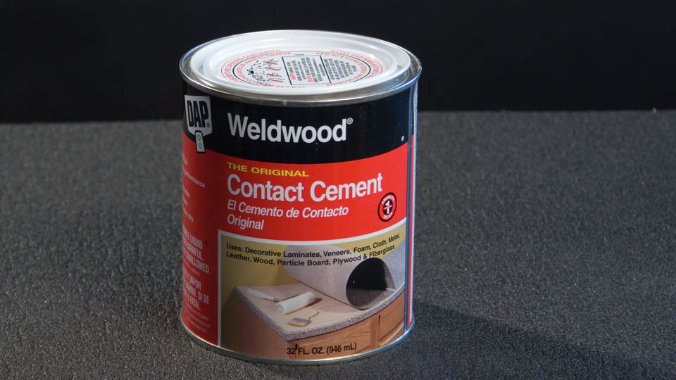 DAP Contact Cement This is a wonderful adhesive if you use it right. Coat each surface to be adhered using a sponge brush. Make sure to cover the whole area with an even coat but don't put it on too thick. Wait for 10 minutes or more until the contact cement no longer looks wet. It should be very tacky but should not come off on your finger when you touch it. It's better to wait longer than to combine the adhesive surfaces too early. |