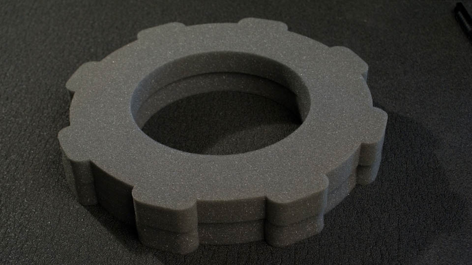 Open-Cell foam (Packing foam or Charcoal foam) Many feel that this type of foam is ideal. You might recognize this as the type of foam used in padded equipment cases. It can be quite firm and still is the most lightweight of the open-celled foams (it can cost less than the green foam too). I'm not aware of local stores that carry it but you can find it readily online ( www.foambymail.com ). Shown are two gaskets that came with air purifier filters - I made them into foam chakrams. |
