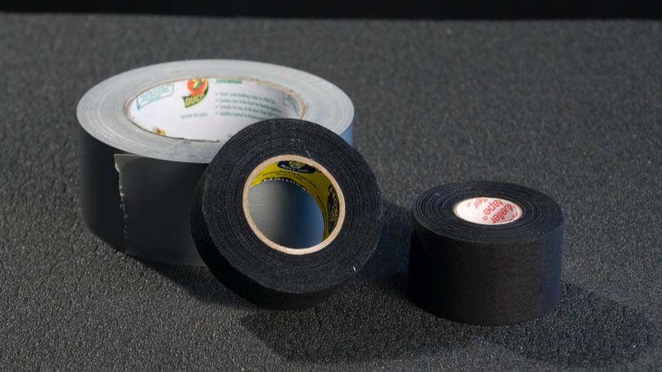 Tape This will be the foundation of your weapon building tools. Duct tape is the main tape used for structural support. It adheres excellently and is a strong tape with very little stretching. Cloth tape is also valuable - these include Hockey tape (first choice) or a good athletic tape. These tapes are used mainly for areas that are held in your hands. They are a comfortable surface and look cool too. |